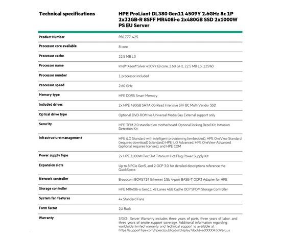 HPE PL DL380g11 4509Y (2.6/8C) 2x32G (p64706) 8SFF MR408i-o 2x480G 2x1000W 4x1Gb NBD333 Smart Choice