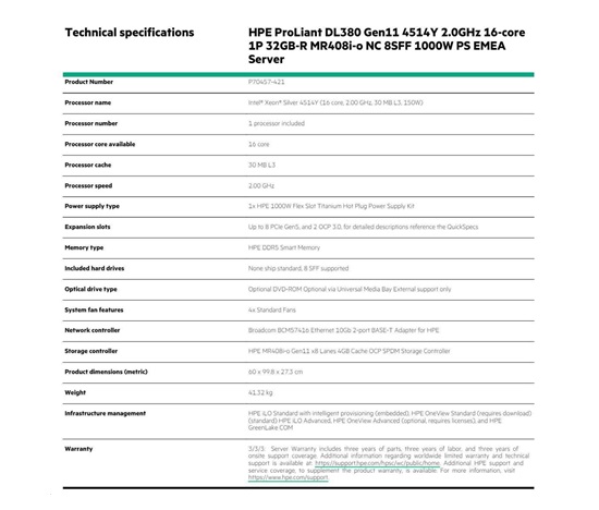 | Product Name | HPE ProLiant DL380 Gen11 6530 2.1GHz 32c 1P 2x32GB-R 8SFF MR416i-o 2x480GB SSD 2x1000W PS EU Server |