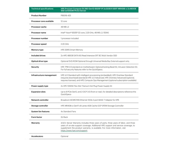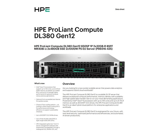 HPE PL DL380 Gen12 6505P (2.2/12C) 2x32G (P69727) 2x480G MR408i-o 8SFF 2x1000W 10GbE NBD333 Smart Choice