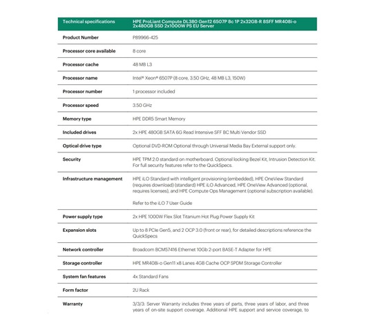 HPE PL DL380g12 6507P (3.5/8C) 2x32G (P69727) 2x480G MR408i-o 8SFF 2x1000W 10GbE NBD333 Smart Choice