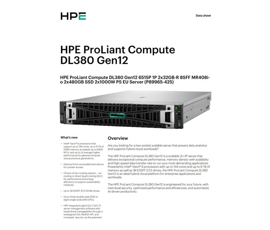 HPE PL DL380g12 6515P (2.4/16C) 2x32G (P69727) 2x480G MR408i-o 8SFF 2x1000W 2p10G-T NBD333 Smart Choice