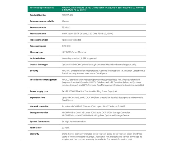 HPE PL DL380g12 6517P (3.2-4.2G/16C) 2x32G (P69727) NS204(2×480) MR408i-o 8SFF 2x1000W 2p10G-T NBD333 Smart Choice