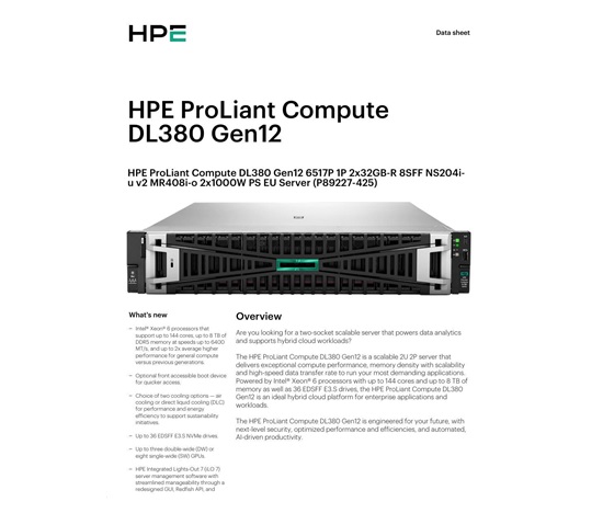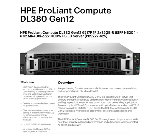 HPE PL DL380 Gen12 6517P (3.2/16C) 2x32G (P69727) NS204(2×480) MR408i-o 8SFF 2x1000W 10GbE NBD333 Smart Choice