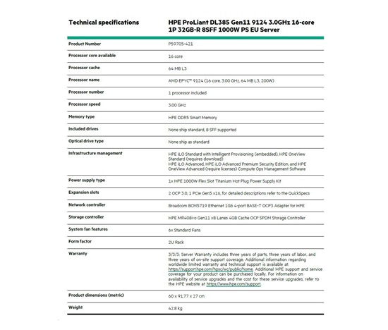 HPE ProLiant DL385 Gen11 9124 2.7GHz 16-core 1P 32GB-R 8SFF 800W PS Server |