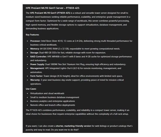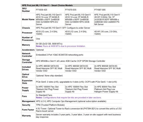 HPE PL ML110g11 4510 (2.4G/12C) 2x32G (P64706) 2x480G (P40497) 2x1000W MR408i-o 8SFF 2x1G NBD333 Smart Choice