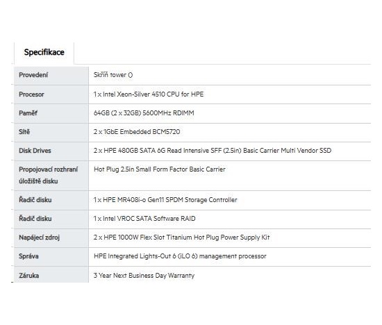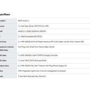 Provedení serveru:Tower; Výrobce CPU:Intel; Maximální počet procesorů:1; Řada procesorů:Intel 12 Core Xeon; SSD Kapacita (GB):480; Model procesoru:Intel Xeon 4510; Velikost paměti RAM (GB):64; Maximální paměťová kapacita serveru (GB):3072; Maximální počet slotů PCIe:5; Maximální počet HDD v serveru:16; Hot-plug cage pro HDD:2.5″ SFF; RAID:1, 5, 10, 50