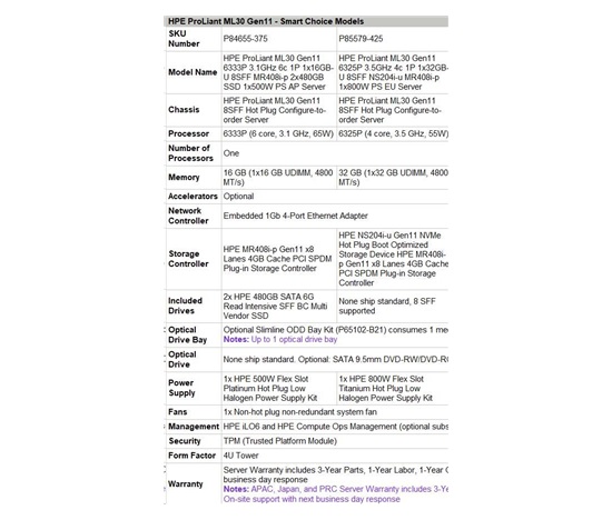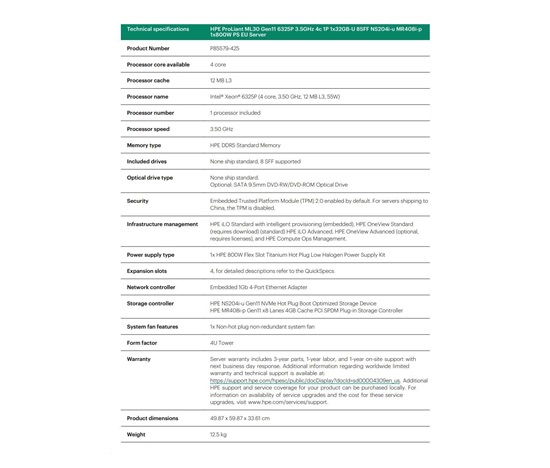 HPE PL ML30g11 6325P (3.5G/4C8T) 1x32G 8SFF NS204i-u(2x480g) MR408i-p/4G 2x800W 3/1/1 Smart Choice