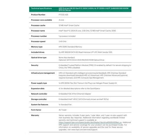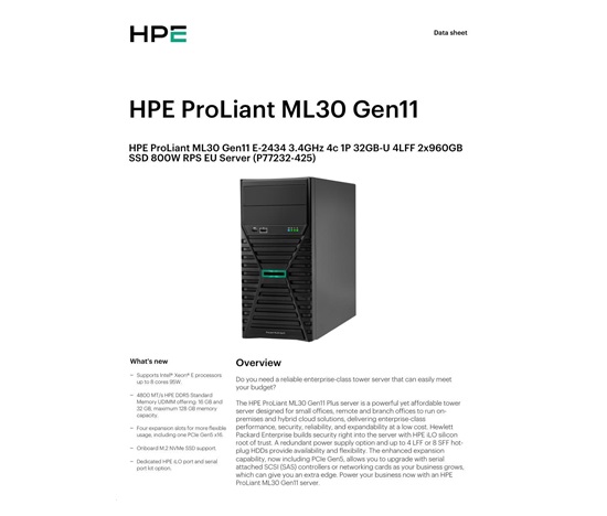 HPE ProLiant ML30 Gen11 E-2434 3.4GHz 4c 1P 32GB-U 4LFF 2x960GB SSD 800W RPS EU Server