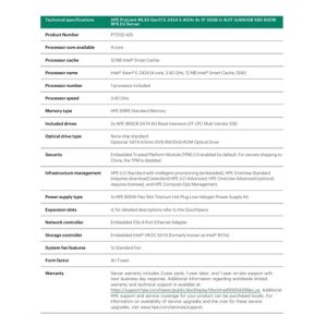 Provedení serveru:Tower; Výrobce CPU:Intel; Maximální počet procesorů:1; Řada procesorů:Intel 4 Core Xeon; Model procesoru:Intel Xeon E-2434; Velikost paměti RAM (GB):32; Maximální paměťová kapacita serveru (GB):128; Maximální počet slotů PCIe:4; HDD Kapacita (GB):960; Maximální počet HDD v serveru:4; Hot-plug cage pro HDD:3.5″ LFF; RAID:1, 5, 10