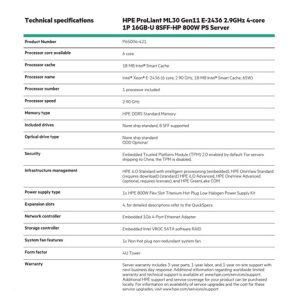 Technical specifications HPE ProLiant ML30 Gen11 E-2436 2.9GHz 4-core 1P 16GB-U 8SFF-HP 800W PS Server