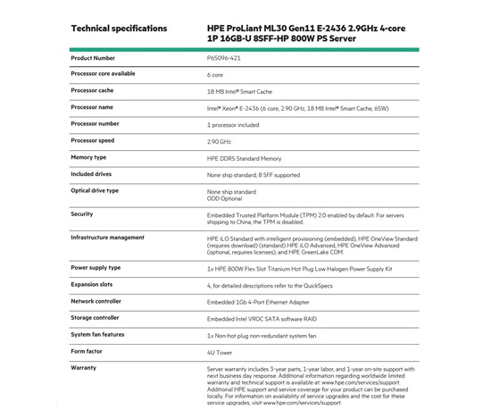 Technical specifications HPE ProLiant ML30 Gen11 E-2436 2.9GHz 4-core 1P 16GB-U 8SFF-HP 800W PS Server