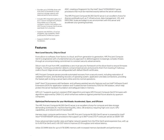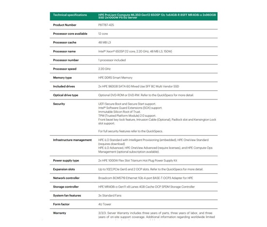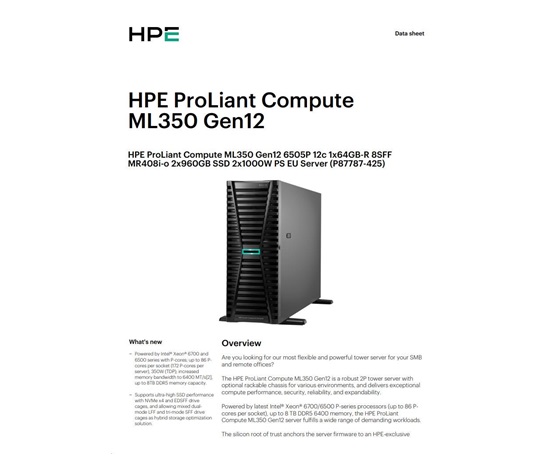 HPE PL ML350 Gen12 6505P (2.2/12C) 1x64G (P69728) 2x960G MR408i-o 8SFF 2x1000W 1GbE NBD333 Smart Choice