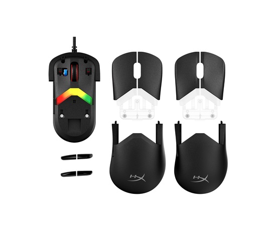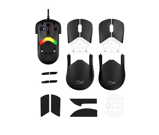 HyperX Pulsefire Saga, protiskluzová páska, náhradní kluznice pro myš, dva kryty tlačítek, dvě skořepiny, dva páry bočních tlačítek, úvodní příručka |