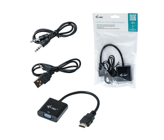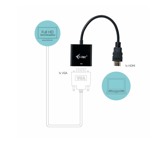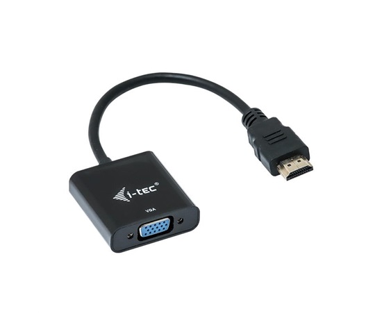 Dlouhý produktový popis: i-tec Adaptér HDMI na VGA, rozlišení Full HD 1920×1080/ 60Hz, délka kabelu 15 cm cable, pozlacený konektor HDMI