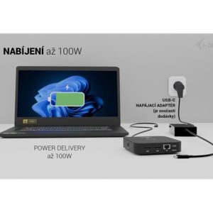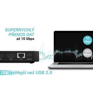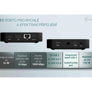 Moderní USB-C dokovací stanice pro kancelářské použití s podporou až dvou externích monitorů v rozlišení 4K. Stanice je kompatibilní s jakýmkoli notebookem vybaveným portem USB-C, USB4 nebo Thunderbolt 3/4/5. Nabízí 6 USB portů, spolehlivé a rychlé připojení k firemní síti díky integrovanému LAN portu a možnost instalace za monitor, což z ní dělá ideálního partnera pro profesionální použití. Samozřejmostí je také schopnost nabíjení notebooku nebo tabletu výkonem až 100 W.