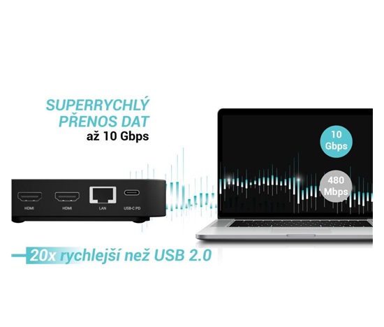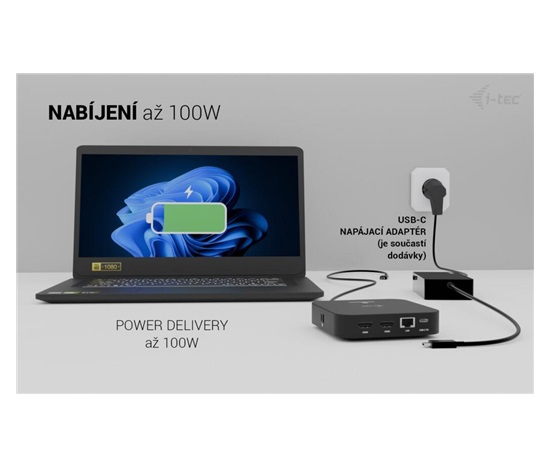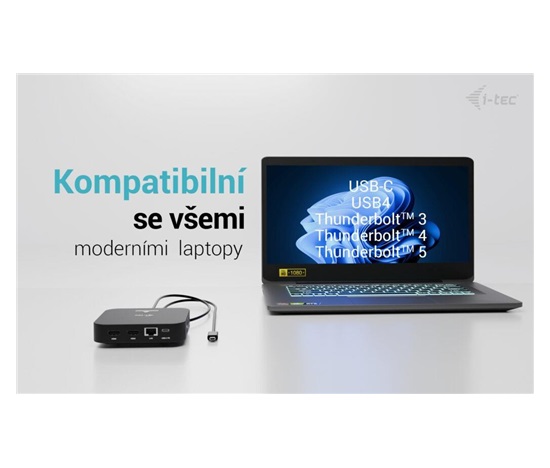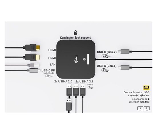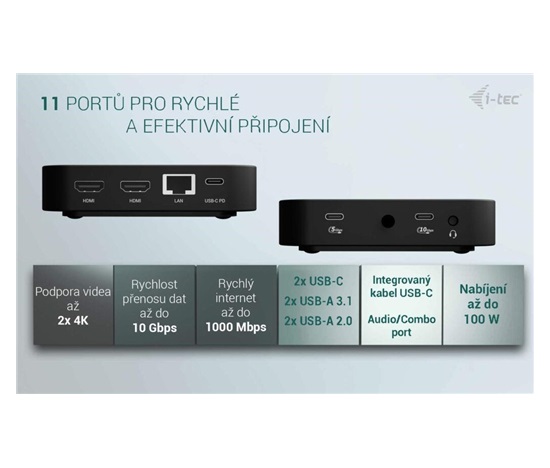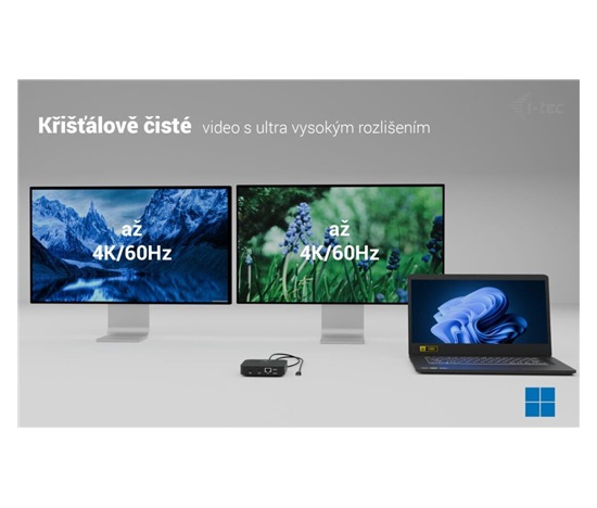 Moderní USB-C dokovací stanice pro kancelářské použití s podporou až dvou externích monitorů v rozlišení 4K. Stanice je kompatibilní s jakýmkoli notebookem vybaveným portem USB-C, USB4 nebo Thunderbolt 3/4/5. Nabízí 6 USB portů, spolehlivé a rychlé připojení k firemní síti díky integrovanému LAN portu a možnost instalace za monitor, což z ní dělá ideálního partnera pro profesionální použití. Samozřejmostí je také schopnost nabíjení notebooku nebo tabletu výkonem až 100 W.