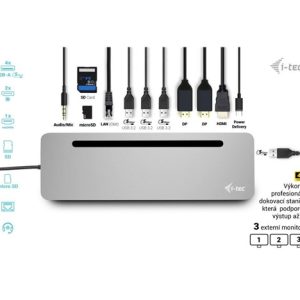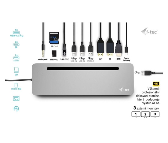 Ergonomická kovová dokovací stanice USB-C s podporou až 3 externích monitorů. Stanice je kompatibilní s jakýmkoli notebookem vybaveným portem USB-C nebo Thunderbolt (60 cm dlouhý integrovaný kabel je dostatečně dlouhý pro připojení všech notebooků s obrazovkami do velikosti 15”). Dokovací stanice poskytuje 4 porty USB, spolehlivé a rychlé připojení k firemním sítím díky integrovanému portu LAN a napájení až 100 W. Konstrukce stanice umožňuje také její použití jako stojanu pro notebook.