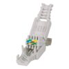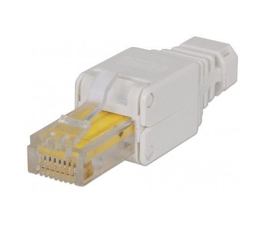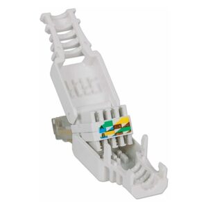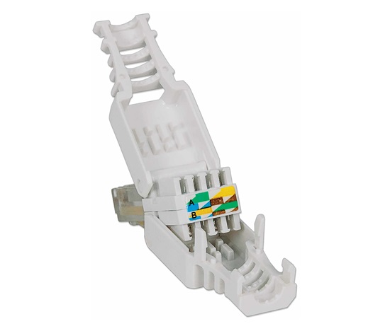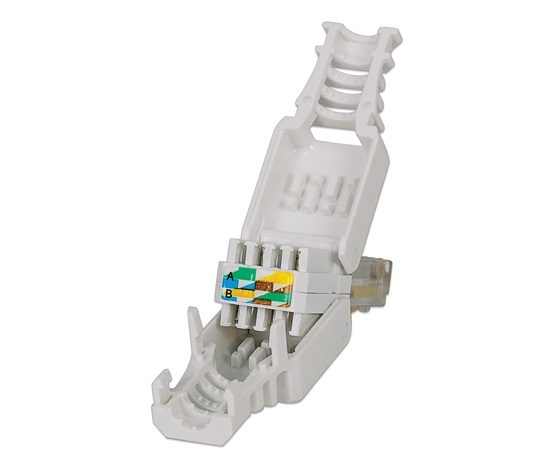S touto beznástrojovou zástrčkou RJ45 od společnosti Intellinet Network Solutions není potřeba krimpovací nástroj. Jednoduše odizolujte asi 15 mm kabelu, vyberte styl zapojení T568A nebo B, umístěte vodiče do příslušného barevně označeného slotu a zavřete patici na kabelu. Po uzavření botičky nad konektory IDC se vodiče zatlačí na místo a vytvoří se spojení.