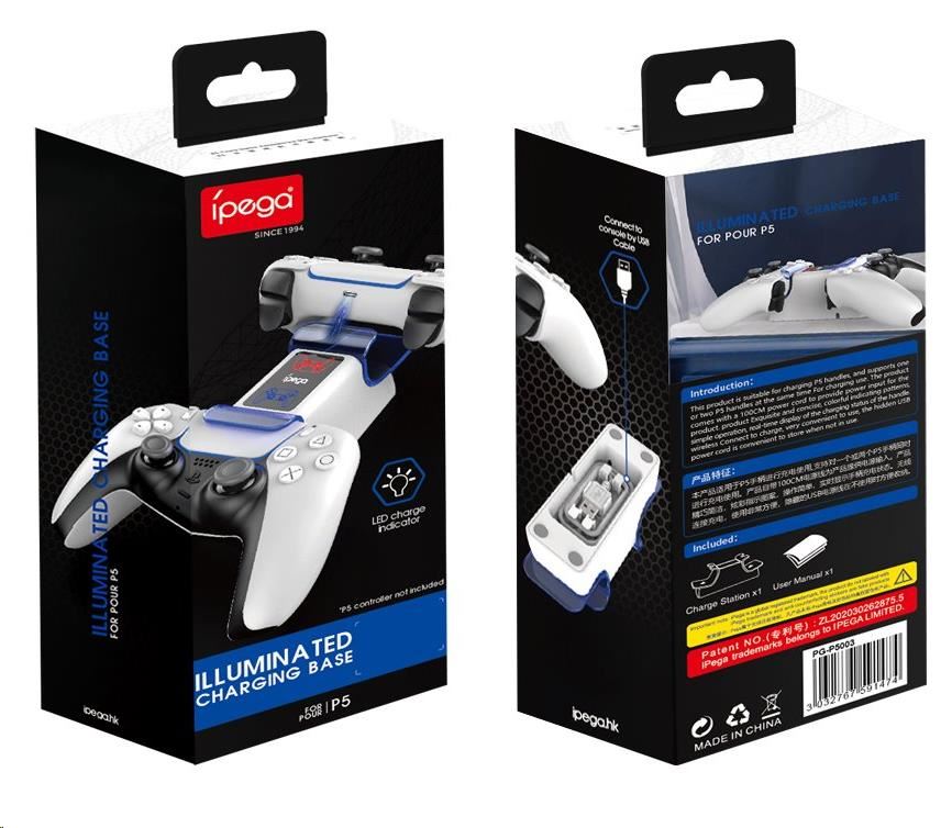 iPega P5003 pro nabíjení až dvou gamepadů pro PS5. Gamepad se jen zapojí do vestavěného konektoru a LED indikace vás informuje o stavu nabití.