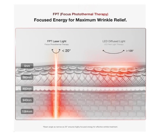Zatímco většina domácích masek spoléhá na technologii LED, JOVS 4D jde o krok dál. Využívá pokročilou FPT (Focal Photothermal Therapy) technologii , která koncentruje energii laseru do úzkých paprsků s úhlem menším než 20° , na rozdíl od více než 120° u běžných LED. Díky tomu pronikají mnohem hlouběji do dermis – vrstvy kůže, kde vzniká kolagen. Díky 6x vyšší energetické účinnosti oproti LED diodám dokáže laser efektivněji stimulovat buněčnou obnovu a cíleně řešit příčiny stárnutí pleti.