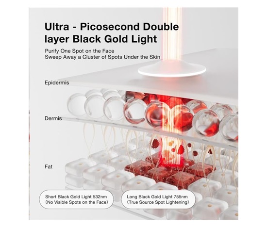 - Režim WHITEN (Bělení skvrn): Cíleně se zaměřuje na tmavé pigmentové skvrny, pihy a stopy po akné. Energie je pohlcena nahromaděným melaninem, který se teplem rozloží na menší částečky a tělo je následně přirozeně odbourá. Skvrny tak postupně blednou a stávají se méně viditelnými.