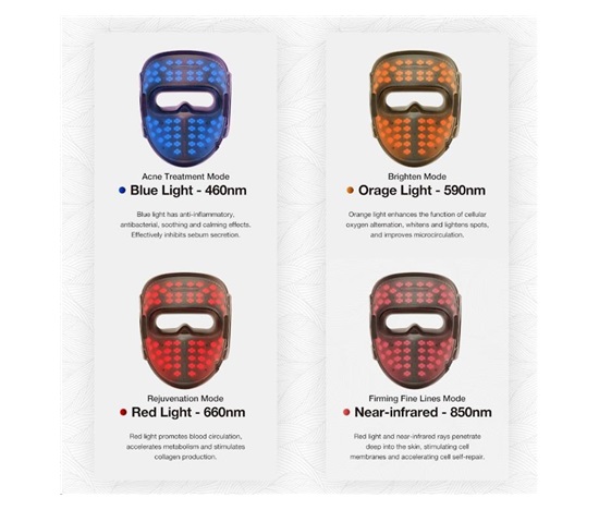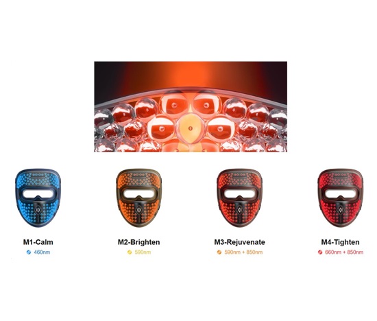 - Čtyři klinicky ověřené vlnové délky pro komplexní péči o pleť: modrá, jantarová, červená a blízká infračervená.