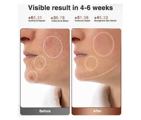 - Viditelné výsledky za 4-6 týdnů: Pravidelné používání prokazatelně redukuje akné, vrásky, pigmentaci a zlepšuje elasticitu pleti.