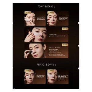 - Den 2 a 4 (Intenzivní výživa): Aplikujete lyofilizované náplasti s hydrolyzovaným kolagenem a peptidy a překryjete je hydratační maskou na 15 minut.