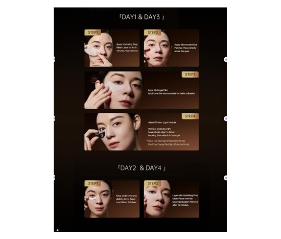 - Den 2 a 4 (Intenzivní výživa): Aplikujete lyofilizované náplasti s hydrolyzovaným kolagenem a peptidy a překryjete je hydratační maskou na 15 minut.