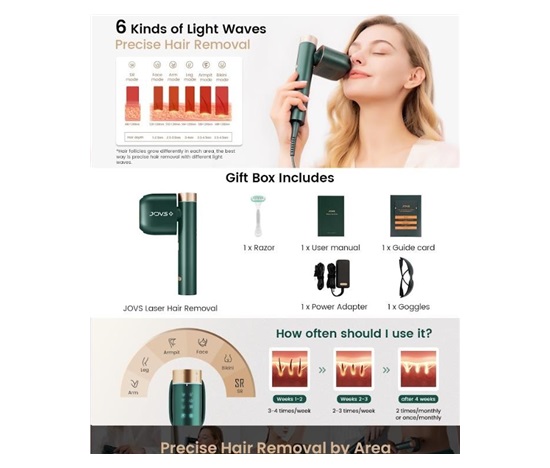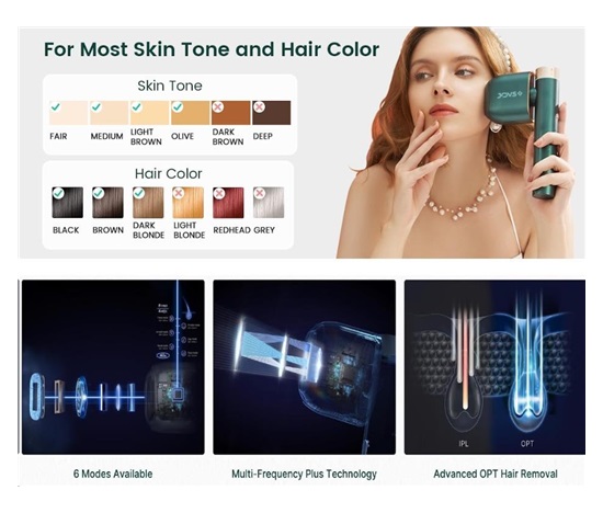 *Toto zařízení může používat kdokoli s typem pleti I až V na Fitzpatrickově stupnici. Pokud máte velmi tmavý odstín pleti (typ VI), toto zařízení prosím nepoužívejte. JOVS Pro II lze použít k ošetření tmavých blond až černých typů chloupků, ale nelze jej použít k ošetření světlých blond, zrzavých nebo šedivých chloupků.