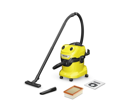 Mimořádně výkonný a energeticky úsporný vysavač s příkonem 1000 W: zařízení mokro-suchého vysavače WD 4 V-20/5/22, sací hadice a podlahová hubice s klipy jsou optimálně sladěny pro dosažení nejlepších výsledků úklidu. Mokré, suché, jemné i hrubé nečistoty jsou odstraňovány nepřetržitě bez výměny filtru. Přístroj se dodává s robustní a nárazuvzdornou plastovou nádobou o objemu 20 l, 5metrovým kabelem, 2,2metrovou sací hadicí, klipovou podlahovou hubicí, plochým skládaným filtrem a vliesovým filtračním sáčkem. Díky patentované technologii lze filtr ve vysavači na mokré a suché vysávání snadno a rychle během několika sekund vyjmout a důkladně vyčistit – aniž by přišel do styku s jakoukoli nečistotou. Tam, kde vysávání není možné, pomůže přídavná funkce fukaru. Odnímatelná rukojeť umožňuje připojení příslušenství přímo na sací hadici. Hadici lze kompaktně uložit na hlavě přístroje. Trubky a podlahovou hubici lze také rychle a pohodlně zaparkovat na nárazníku. Mezi další výhody patří uzamykací systém „Pull & Push“ pro snadné otevírání a zavírání nádoby a ergonomicky tvarovaná rukojeť pro pohodlné přenášení vysavače.