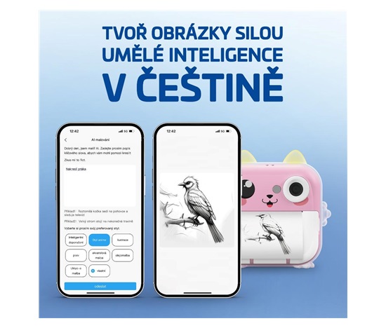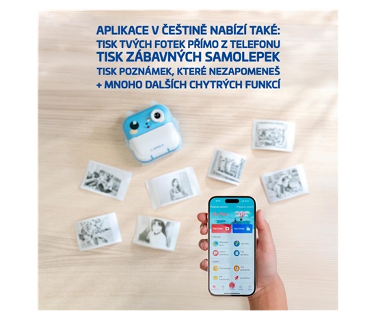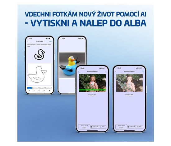Foťák je propojený s chytrou aplikací v češtině, takže jeho ovládání zvládnou i menší děti. Aplikace toho ale umí mnohem více. Kromě tisku fotek, poznámek nebo samolepek přímo z telefonu zvládá i skenování ručně psaných zápisků, překlady textů z obrázků, AI vybarvování, tvorbu obrázků pomocí umělé inteligence nebo převod fotografií do animovaného stylu. Stačí pár kliknutí a děti si samy vytvoří obrázky přesně podle své představivosti.