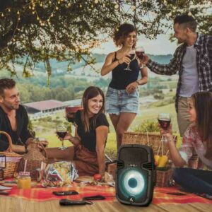 Je jedno, kde si chceš zrovna zatancovat. Madlo, kompaktní rozměry a nízká váha ti usnadní přenášení a s voděodolností IP54 vydrží reproduktor vlhkou trávu i spršku vody. Díky baterce můžeš poslouchat až 16 hodin bez zásuvky. Zapni dynamické LED osvětlení a užij si audiovizuální show. Když ti dojdou playlisty, přepni na FM a kvůli změně hlasitosti ze židle nevstávej – hodíme ti k repráku i dálkové ovládání.