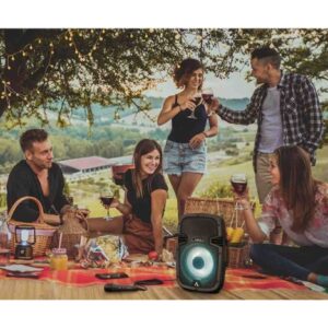Je jedno, kde si chceš zrovna zatancovat. Madlo, kompaktní rozměry a nízká váha ti usnadní přenášení a s voděodolností IP54 vydrží reproduktor vlhkou trávu i spršku vody. Díky baterce můžeš poslouchat až 16 hodin bez zásuvky. Zapni dynamické LED osvětlení a užij si audiovizuální show. Když ti dojdou playlisty, přepni na FM a kvůli změně hlasitosti ze židle nevstávej – hodíme ti k repráku i dálkové ovládání.
