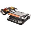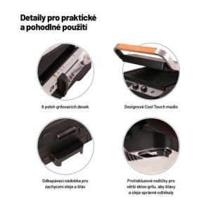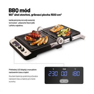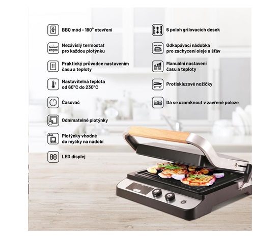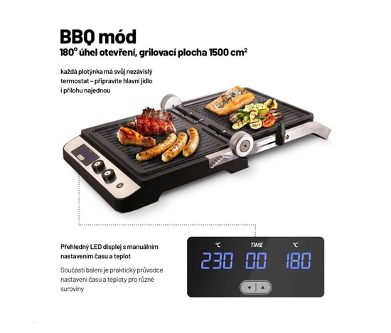 Plotýnky grilu mají nastavitelnou polohu. Můžete například upravit výšku a sklon plotýnky tak, aby se snížil tlak působící na křehké suroviny, jako jsou třeba čerstvé ryby. V BBQ módu si u každé z plotýnek můžete nastavit požadovanou teplotu ohřevu separátně. Se správnou volbou teploty pro jednotlivé druhy potravin vám pomůže přiložený průvodce. Zároveň si pro každý pokrm můžete nastavit požadovaný čas přípravy, takže se nemusíte bát, že netrefíte správný stupeň propečení. Gril je vybaven i funkcí automatického vypnutí, díky vysokému výkonu se velmi rychle rozehřeje a o průběhu přípravy máte přehled díky LED displeji. V nabídce jsou i ploché plotýnky pro ještě širší možnosti grilu.