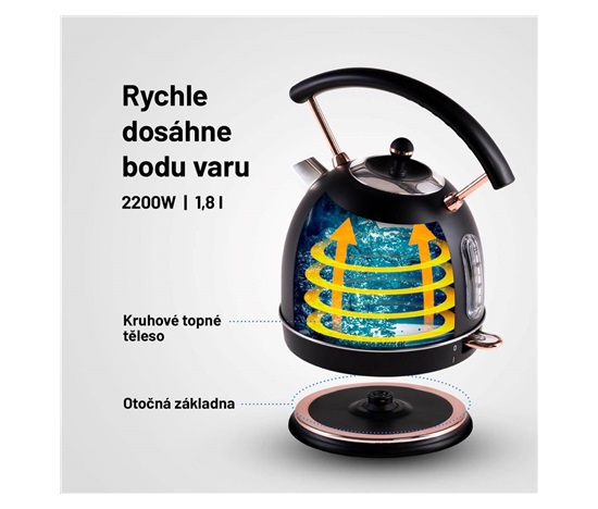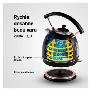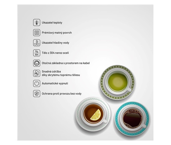 Rychlovarná konvice objem 1,8 l, příkon 2200W, ukazatel teploty vody, materiál nerez, prémiový matný povrch, ochrana proti chodu naprázdno, ochrana proti přehřátí, otočná základna, podsvícený vypínač, úložný prostor pro kabel