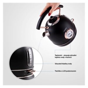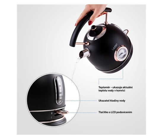 Rychlovarná konvice je jistě nepostradatelnou součástí každé kuchyně. Může být ale zároveň stylovým doplňkem, který pozvedne váš interiér na vyšší úroveň. Lauben Electric Kettle 17BC je designová rychlovarná konvice ve stylu Artdeco s prémiovým matným povrchem z #304 nerezové oceli. Údržba konvice je snadná, topné těleso je skryto, tudíž se méně zanáší a konvice se lépe čistí. Mysleli jsme i na bezpečnost, konvice má pojistku proti přehřátí i vaření bez vody. Aktuální teplotu vody můžete sledovat na teploměru na konvici. Potřebujete-li zalít zelený čaj, nemusíte čekat, až voda vychladne, ale stačí prostě včas vypnout. Díky svému designu konvice nejen dobře vypadá, ale je i praktická. Základna je otočná o 360° pro jednoduchou manipulaci a samozřejmostí je prostor pro skrytí kabelu, který jinak překáží a nevypadá hezky.