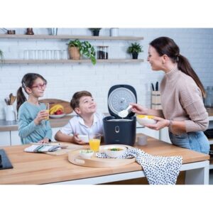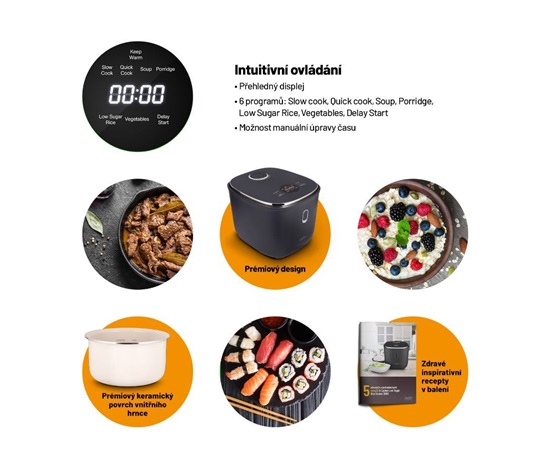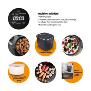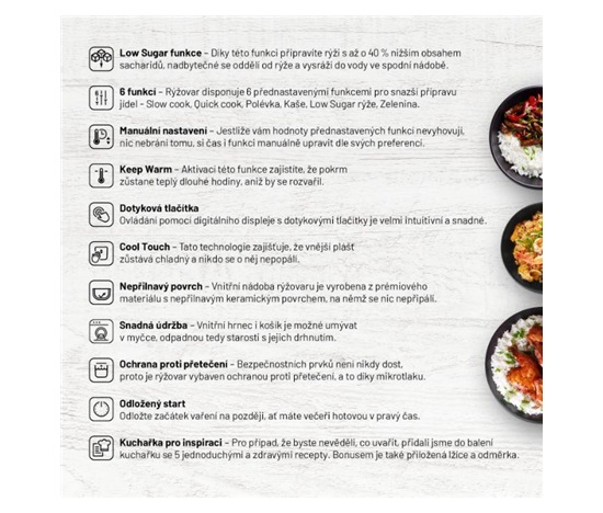 Kromě toho, že stiskem jediného tlačítka připravíte dokonale všechny druhy rýže, využijete rýžovar i pro další pokrmy. 6 šikovných přednastavených funkcí – Slow cook, Quick cook, Polévka, Kaše, Low Sugar rýže, Zelenina – si poradí i s přípravou luštěnin či ovesných kaší. Pokud by vám nastavené hodnoty nevyhovovaly, čas i funkci upravíte manuálně. Někdy je potřeba jídlo udržovat teplé, což zvládne funkce Keep Warm. Pro počáteční inspiraci jsme k rýžovaru přibalili kuchařku, která obsahuje 5 zdravých a snadných receptů.