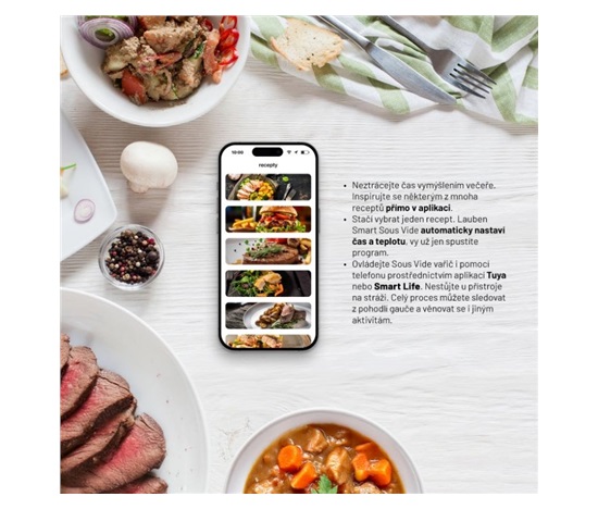 Ovládejte Sous Vide vařič i pomocí telefonu aplikacemi Tuya nebo Smart Home. Nestůjte u přístroje na stráži, kontrolujte celý proces z pohodlí gauče a věnujte se při vaření i jiným aktivitám.