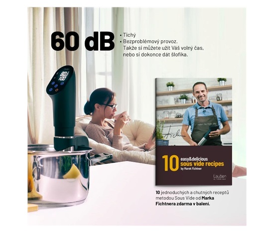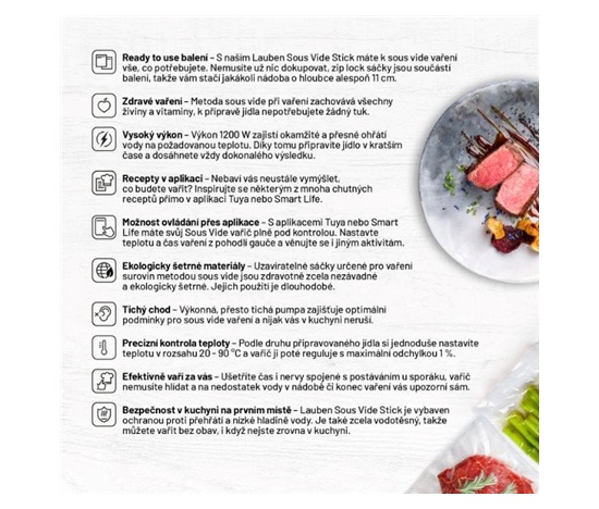 Chcete si pochutnat na vynikajícím, zdravém jídle, jehož příprava vám nezabere celé odpoledne? Chcete si doma připravit maso, co se bude rozpadat na jazyku, ale přitom neztratí na objemu a vždy si zachová svůj tvar a barvu? Nemusíte nutně chodit do restaurace. Lauben Smart Sous Vide je ideálním pomocníkem do kuchyně pro každého, kdo chce ušetřit hodiny strávené u sporáku, a přesto dostat z ingrediencí maximum. Díky metodě vaření sous vide si připravovaná jídla zachovají všechny chutě, vůně a živiny, o které nechcete při vaření přijít. Vařič jednoduše zapnete a ponoříte do hrnce s potravinami připravenými ve speciálních zip lock sáčcích, které jsou součástí balení. O ostatní už se Lauben Smart Sous Vide postará, vy si jen vychutnáte famózní výsledek.
