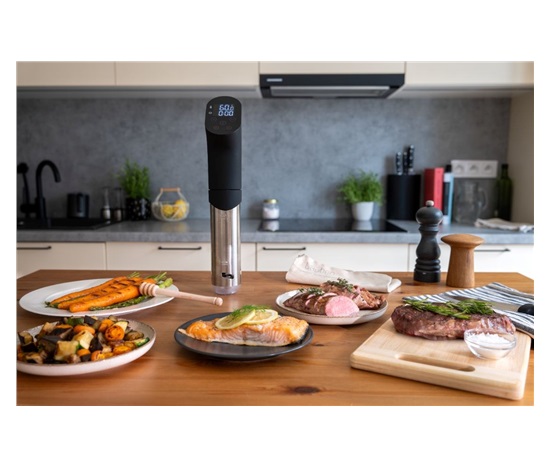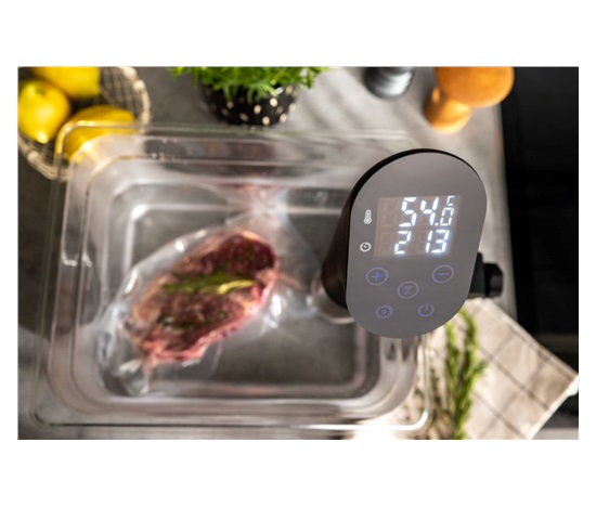 Lauben Smart Sous Vide je zároveň stylovým designovým doplňkem, spodní část je z bezpečné nerezové oceli a držadlo příjemné na dotyk. Díky oválnému tvaru a textilnímu obalu ho uskladníte v kterékoliv kuchyni. Žádné další kuchyňské spotřebiče a příslušenství kupovat nemusíte.