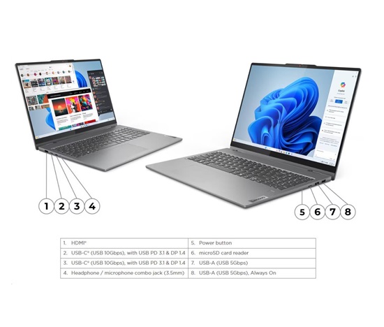 | Standartné porty | 1x USB-A (USB 5Gbps / USB 3.2 Gen 1) 1x USB-A (USB 5Gbps / USB 3.2 Gen 1), Always On 2x USB-C (USB 10Gbps / USB 3.2 Gen 2), with USB PD 3.1 and DisplayPort™ 1.4 1x HDMI 1.4b 1x Headphone / microphone combo jack (3.5mm) 1x microSD card reader |