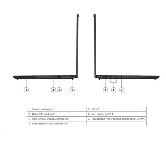 | Standartné porty | 1x USB-A (USB 5Gbps / USB 3.2 Gen 1), Always On 2x USB-C (Thunderbolt™ 4 / USB4 40Gbps), with USB PD 3.0 and DisplayPort™ 2.1 1x HDMI 2.1, up to 4K/60Hz 1x Headphone / microphone combo jack (3.5mm) |