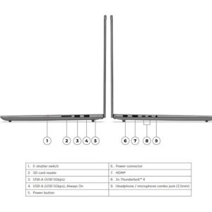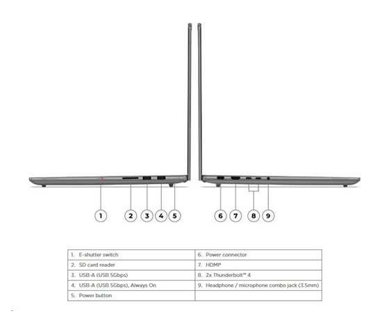 | Standartné porty | 1x USB-A (USB 5Gbps / USB 3.2 Gen 1) 1x USB-A (USB 5Gbps / USB 3.2 Gen 1), Always On 2x USB-C (Thunderbolt™ 4 / USB4 40Gbps), with USB PD 65-100W and DisplayPort™ 2.1 1x HDMI 2.1, up to 8K/60Hz 1x Headphone / microphone combo jack (3.5mm) 1x SD card reader 1x Power connector |