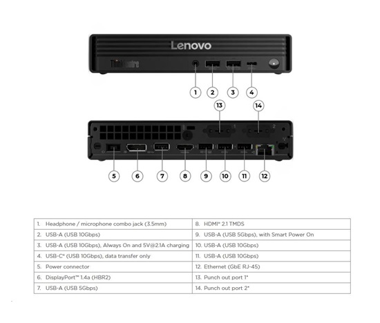 | Predné porty | 1x USB-C (USB 10Gbps / USB 3.2 Gen 2), data transfer only 2x USB-A (USB 10Gbps / USB 3.2 Gen 2), one supports Always On and 5V@2.1A charging 1x headphone / microphone combo jack (3.5mm) |