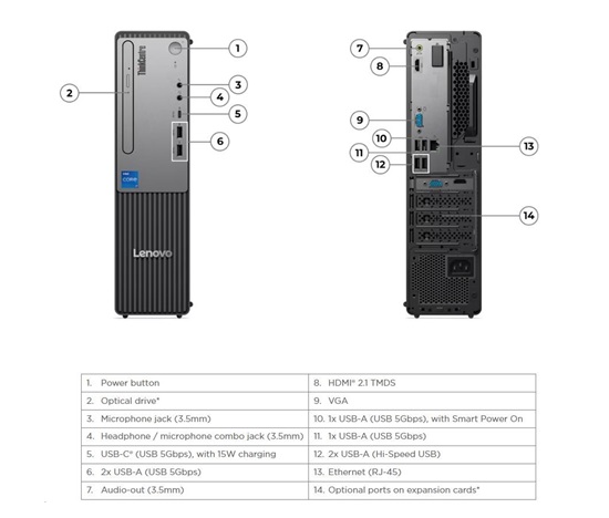 | Zadné porty | 2x USB-A (Hi-Speed USB / USB 2.0) 2x USB-A (USB 5Gbps / USB 3.2 Gen 1), one supports Smart Power On 1x HDMI 2.1 TMDS 1x VGA 1x Ethernet (RJ-45) 1x line-out (3.5mm) |