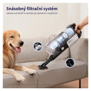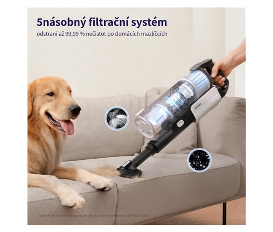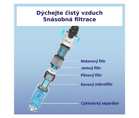 Tyčový vysavač Levoit je navržený, aby maximálně usnadnil úklid vašeho domova, ať už ho sdílíte se čtyřnohým, nebo dvounohým miláčkem. Vysavač je vybaven rotačním kartáčem s kombinací gumových a textilních lamel, který byl navržen tak, aby na něm nedocházelo ke hromadění namotaných vlasů nebo chlupů. Zároveň je ale kartáč efektivní a zachytává maximální množství nečistot. Vysavač pracuje s 22,2V vyjímatelným akumulátorem s kapacitou 2200 mAh a indikací nabití. Motor je s výkonem 180 W nezvykle tichý, při běžném provozu vydává 74 dB, v Turbo režimu pak 81 dB. Vysavač s plně nabitou baterií dokáže pracovat až 50 minut, což umožní úklid celého obydlí na jedno nabití. Úklid s LVAC 200 je radost díky jeho velmi nízké hmotnosti 1,45 kg. Díky tomu je snadné s vysavačem odstranit i pavučiny ze stropu, prach ze žaluzií nebo nečistoty pod nábytkem. V balení naleznete dlouhou a krátkou násadu, rotační kartáč, 2v1 kartáč na čalounění nebo zvířecí srst a 2v1 štěrbinový nástavec s kartáčem. Tím máte perfektní sadu nástrojů pro kompletní úklid. Levoit LVAC si hravě poradí se všemi povrchy, ať už jsou to koberce, tvrdé podlahy nebo čalounění. Kartáčový nástavec je navíc vybavený LED světlem, takže umožní práci v tmavých zákoutích, a navíc osvětluje přítomné nečistoty. Vysavač v sobě skrývá 5násobný filtrační systém, který odstraňuje částice od velikosti 0,3 mikrometrů. Nečistoty se shromažďují v 0,75L nádobě s mechanizmem pro snadné a hygienické vyprazdňování. Filtry i kartáč jsou jednoduše vyjímatelné a omyvatelné.
