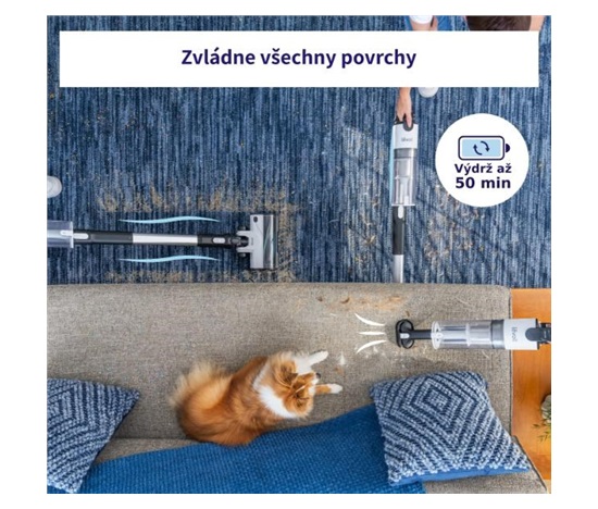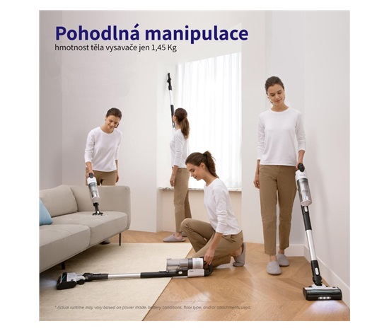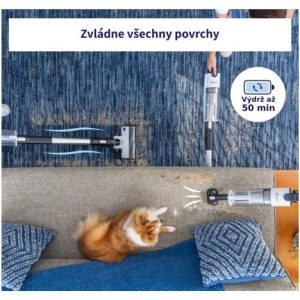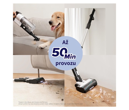 Vysavač je vybavený 180 W bezkartáčovým motorem, který pohání 2200 mAh baterie. Díky kombinaci moderního motoru a velké baterie je vysavač je tak nejen tichý, ale hlavně vydrží pracovat opravdu dlouho. Při běžném úklidu vydrží vysávat až 50 minut, a to stačí na úklid celého prostoru. Motor má 100.000 otáček a poradí si tak i s těžšími nečistotami jako je písek a jiný venkovní materiál.