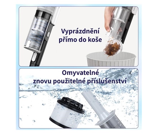 LVAC200 můžete stiskem jednoho tlačítka vyprázdnit přímo do koše. Jeho filtry a kartáče jsou navíc omyvatelné. Hygiena zaručena.
