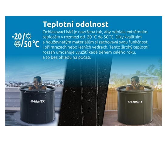 Káď je navržena tak, aby odolala teplotám od -20 °C do 50 °C. Díky tomu je ideální pro využití v jakémkoli počasí a ročním období.